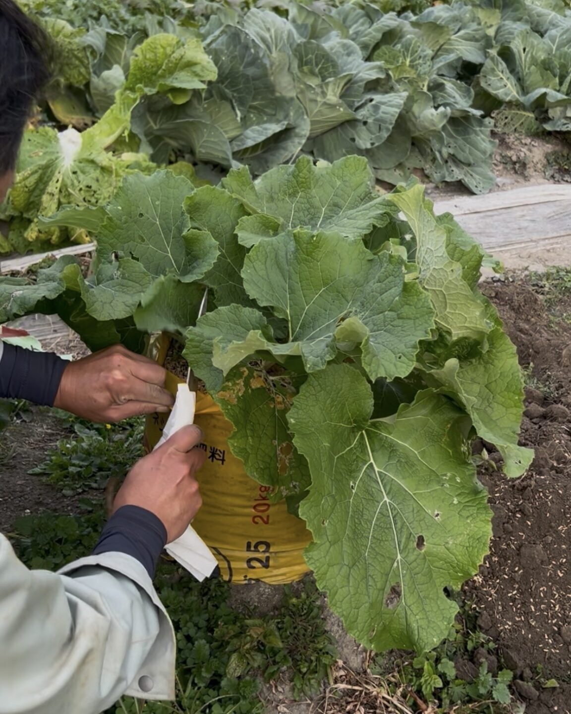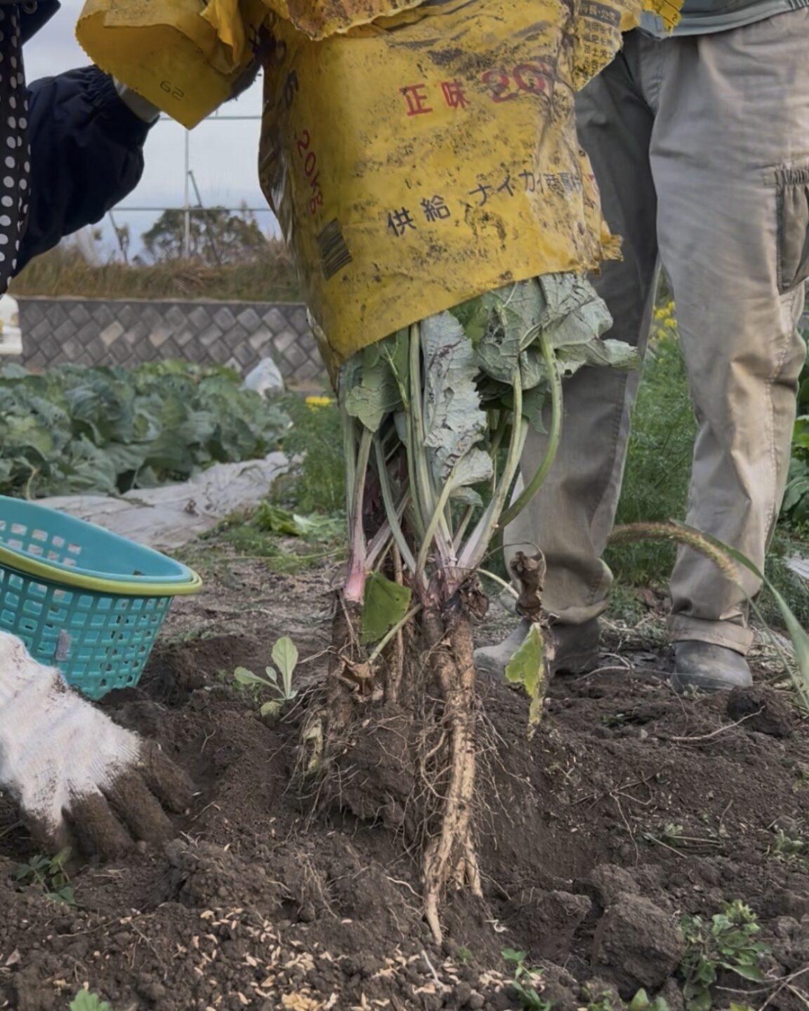 肥料袋の両端を切って開いて畑に置き、その中に土を入れて、種を撒きました🌱その後は、大きな葉を展開してスクスク育ってくれたようで、この日はいよいよ収穫の日!